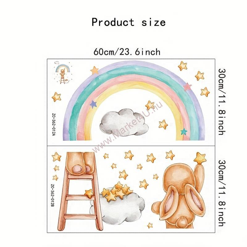 A legcukibb kislányszoba dekoráció nyuszikával és szivárvánnyal. A falmatrica elemeit külön lehet felragasztani, igy a végeredmény a fantáziántól függ.